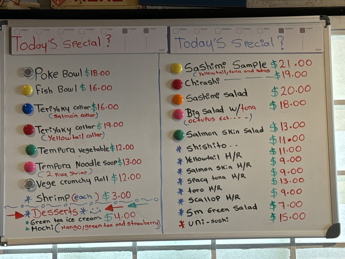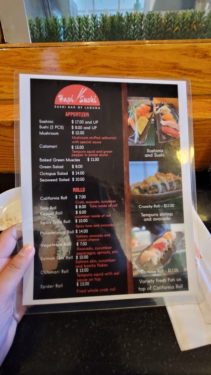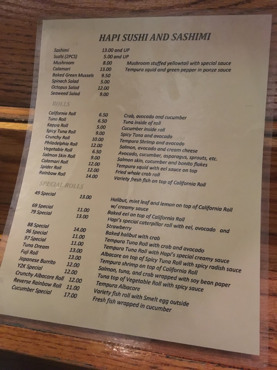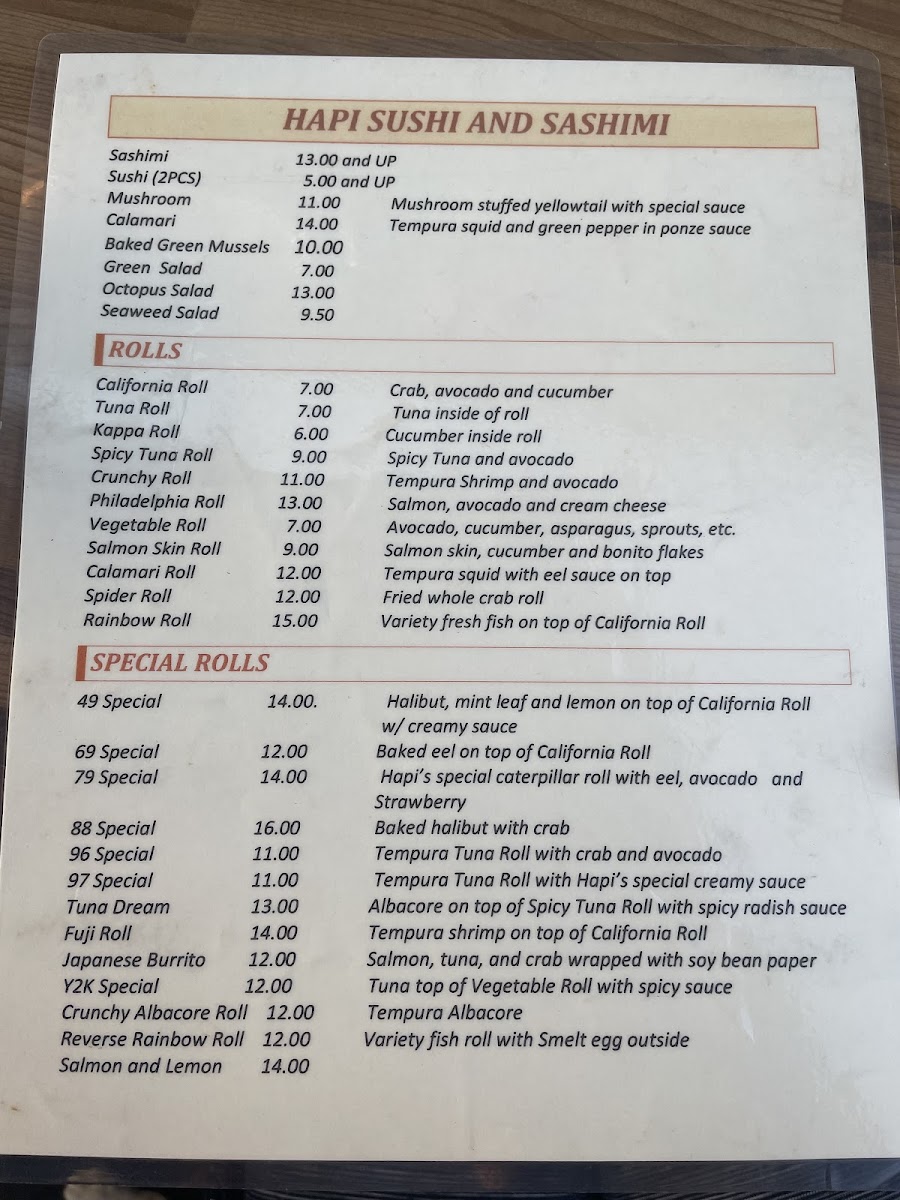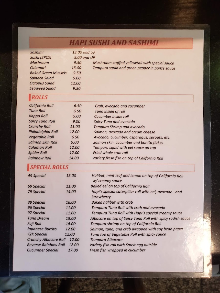 From a reviewer’s perspective, the menu at Hapi Sushi offers a well-rounded and satisfying selection that caters to both traditional sushi lovers and those seeking variety. The standout sushi cut rolls like 49 Special, 69 Special, 79 Special, 88 Special, and 96 Special provide a range of premium options, while bowls such as the Poke Bowl, Chirashi Bowl, and Chicken Kaarage Bowl add hearty alternatives. Starters like Gyoza and Miso Soup are complemented by more unique bites like Shishito Pepper Calamari, and the salad selection-from Green Salad to Sashimi Salad-keeps things fresh and balanced. The nigiri and sashimi offerings, including Albacore Nigiri and Ikura Sashimi, highlight quality seafood, while hot dishes like Yellowtail Cheek Collar and Tempura Noodle Soup bring comforting depth. Handrolls such as Spicy Tuna Handroll and Toro Handroll are simple yet satisfying, and desserts like Green Tea Ice Cream and Mango Mochi provide a sweet finish. Though prices are only clearly listed for the specials, the variety and thoughtful composition of the menu make it an appealing dining experience overall.